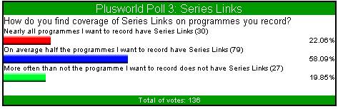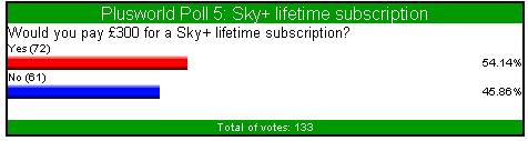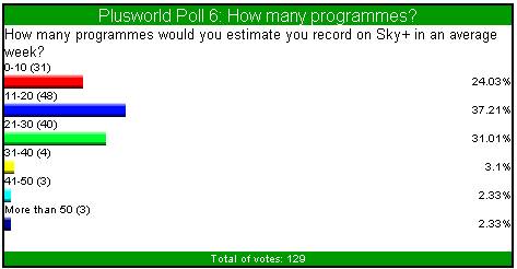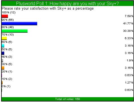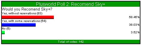 | How Happy Are You With Your Sky + Please rate your satisfaction with Sky + as a % Total Of 158 Votes Conclusion How good a product is Sky +? Well whenever anything new is released there's always the accompanying hype. We all like time to sit down and relax, and go through all the emotions of having a new toy to play with. Record onto a hard disc ? Pause live TV ? This must surely be a misprint. Well it soon became very clear that this, and more, was actually possible with Sky +. It certainly seems clear that the majority of the current 158 votes feel that Sky + is a worthy investment. 12 votes have obviously never had a problem with Sky + as they are 100% satisfied. The remaining 146 votes, 114 (78.08%) seem happy enough to vote as high as 80 - 90%. Incidentally 1 person felt that disappointed with the machine they gave it 0%......I wonder if he/she realises that you actually need a television to use and appreciate Sky +. ![]() Recommend Sky + Would You Recommend Sky + Total Of 142 Votes Conclusion Now this is a test of that friendship! Lets face it you've had to listen to him deliberating about Sky + for months now. Its's not cheap, and you know he's still paying back that damn student loan. Should I recommend it ? Shouldn't I recommend it ? Ah good lad, you've made the right decision, anyway foods for wimps and at least you can play with series links and live pause to take away the hunger pains. You may not go quite to these lengths to recommend it, however out of 142 votes 83 (58.45%) think that the machine is so good they would recommend it without reservation. A slightly more cautious 54 votes (38.02%) would recommend with some reservation, and 5 votes (3.6%) felt that they couldn't recommend it as they thought you probably needed a damn good square meal!!..........Oh those student days!! ![]() Series Links How do you find coverage of series links on programmes you record ? Total Of 136 Votes Conclusion When Sky + was released, Series Links had to wake up and smell the coffee. They were now expected to blossom from their slumber and take charge of the whole operation. We all have our favourite programmes that it would be a crime to miss and therefore we have come to expect all of these programmes to be blessed with that familiar green icon. Well it seems that despite the occasional broken link we're mostly very grateful with the way our programmes are treated. Out of 136 votes, 109 (80.15%) are happy that their favourite programmes they like to record are linked. 26 votes (19.11%) feel that the programmes they enjoy recording are not linked. As previously mentioned, this poll was was conducted nearly a year ago, so I would suggest to those 26 voters to go back and hunt out out those series links as the amount of channels/links are increasing all the time. Failing that, may I suggest you stop recording those shopping programmes through the night!! ![]() Hard Drive and Viewing Needs Is your Sky + hard drive big enough for your viewing needs ? Total Of 126 Votes Conclusion Now one of the main attractions of Sky +, apart from watching one channel whilst recording another, has to be that the old blank VCR tape is a thing of the past. We've all frantically rummaged through the stock pile of old tapes, looking for that spare half hour that may or may not be on that Scotch E120, just so you can quickly insert and record ' Going For Gold ' The beauty of the hard drive is that all those tapes can now be banished to the back bedroom wardrobe, as everything can be put onto disc. The only possible problem all you Henry Kelly fans are now faced with is.....is there enough hard disc space left, after everything else has been recorded. With so many channels on Sky these days, is there a problem with only having approximately 20hrs of space to play with. Well from 126 votes, 67 votes felt that they sometimes ran low on disc space. 30 votes (23.81%) felt that this size disc was perfectly adequate, and interestingly about the same again struggled to delete enough recorded material to record new programmes and this was always a problem. ![]() Sky + Lifetime Subscription Would you pay £300 for a Sky + lifetime subscription ? Total Of 133 Votes Conclusion When Sky + was first talked about, the majority of the marketing push was how much this integrated Satellite PVR could transform your life and viewing habits. The majority of us had probably never even contemplated recording programmes onto a hard drive, let alone pausing live TV and watching one channel whilst recording another. Once Sky had sold this, then came the price. The majority of early buyers probably paid about £300, but rightly or wrongly accepted this, and continued to want this box beneath their TV's. Then came the slap across the face. An extra £10 to pay each month on top of the price for the box and your regular monthly Sky subscription. According to Sky this is to keep the cost of the box down to an acceptable price, and to help with future s/ware upgrades......MMmmmmm. So let me get this right, an extra £120 a year just to press a button that says record!! Hold on, doesn't that mean that I've paid £240 + for something that still doesn't have Dual Record. With the possibility of paying £300 for a lifetime sub forever being muted, do loyal and new subscribers find this an attractive option. Well at this stage it appears that opinions are divided, with yes you would, marginally creeping ahead with 54.14%, compared to no you wouldn't with 45.86% ![]() How Many Programmes How many programmes would you estimate you record on Sky + in an average week ? Total 129 Votes Conclusion Well lets just see exactly how much Sky + has changed your viewing habits. We all lead busy lives these days, whether its being stuck in the office or on the road in the car. You could even be busy at home or keeping the kids occupied. The selling point of Sky + has always been the ability to record your programmes, forget about them, and then catch up when i