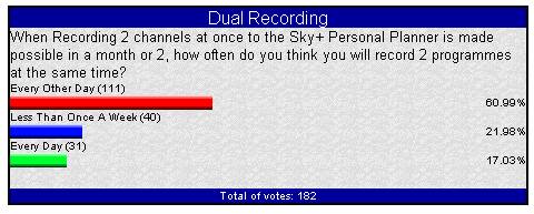 With the amount of channels on Sky Digital these days, it appears that users would welcome the opportunity to record 2 programmes avoiding clashes. Out of the 60 votes, 37 (61.66%) said it was extremely important, and 21 votes (35%) thought it was very or quite important. Only 2 votes (3.33%) thought that it wasn't. Sky + have promised this function for many months now, and it appears that they can rest assured that all the planning and development that went into providing this function, would've certainly been worth their trouble.