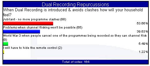 Ah good question..........Will we have reservations about the soon to be introduced function........A resounding NO echoes around Plusworld HQ. It seems that a good 53.66% (88 votes) want it NOW!! A rather British like 65 votes (39.63%) still have doubts when it comes to channel surfing. Thankfully I feel reassured that the Dual Record function will be the most important feature in at least 2 households, as they feel that the remote control will have to be hidden to avoid all domestics!!