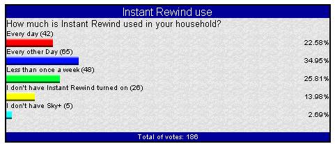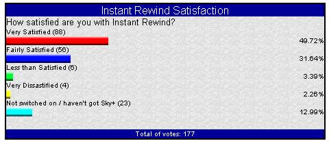 To conclude Instant Rewind, a good 142 votes, equating to 80.22% felt either very satisfied or fairly satisfied with the function. Proof really that when you're paying for a premium product and service, and offered an advanced function, subscribers like to make sure that they have as many opportunities not to miss any part of the programme. Only a very small minority expressed their concern on the matter, could this be because you can't currently archive this saved programming ?