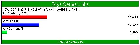 | Sky + Series Links How content are you with Sky + Series Links ? Total Of 210 Votes Conclusion Well we cannot complain about what the Series Link is there to do. In a world where we don't really want to become too dependant on machines, the fact that by pressing buttons and selecting programmes that can be linked to set up the next reminder or recording of your favourite programme, is very welcome indeed. Now setting these up and enjoying them should be very easy indeed, however too many of us are fully aware of the Series Links failings, and therefore possibly missing the next programme in the series. Because of this only 13 voted (6.19%) were very content with series links, however 51.43% are still understandably not content with the link and feel that there are still far too many failings to be fully satisfied. 89 people (42,38%)voted that they were content, possibly the very lucky ones that viewing pleasure has not been disrupted. : ![]() Adverts Adverts How often do you watch adverts on Sky + ? Total Of 198 Votes Conclusion Latest kitchen cleaner, new flavour of crisps, maybe the brand with the new inflatable wings.........What are you talking about you cry. Well you could be forgiven for not realising that I was trying to sell you something. We see them on our screens everyday, but do we really watch those adverts. Well a huge 180 votes say that you never/rarely bother to sit around and watch them on Sky +. This equates to 90.91%. In comparison only 17 votes were registered for sometimes watching them, and a very sad 1 vote confessed that they always watch them. ![]() Sky Box Office How many Sky Box Office Movies have you recorded to Sky + since Sky + was installed ? Total Of 184 Votes Conclusion With the amount of film channels on Sky these days, does anyone really want to pay the extra £3.75 to watch a movie 6 months earlier on Sky Box Office. With Sky + not only can you watch them off SBO, but you can now record them to the Sky + planner. Once recorded they can be kept in the planner for 7 days, and if you don't watch them you don't get charged. Theoretically this means that you could build up your very own library of SBO movies, and then pick them off to watch at your leisure. Whether this is common practice, I don't know, although 113 votes (61.41%) tells me that this is not high priority. A modest 58 votes (31.52%) have occasionally recorded between 1 - 10 movies, and 6 votes (3.26%) have recorded over 10. ![]() Missing Sky + Planner Entries In 2003 have you had any Sky + planner entries disappear by themselves ? Total Of 140 Votes Conclusion Now lets face it, how many times have you bought flowers for the wife, nice chocolates even or maybe even done the housework for a whole week. You were sure that programme was in the planner to record for your wife yesterday. You must be going mad...............no don't worry you're probably not. Unfortunately after nearly 2 years there still seems to be bugs that strike at any time and erase programmes from the planner. 65% of users have had the misfortune of this happening, whilst about one third of our respondents have never had to scratch their heads in utter bewilderment. Assuming our voters are typical - this means 65% of ALL users lose planner entries. This is far too high and Sky really need to sort this problem out...........if only for the fact that the wife doesn't like chocolates, I suffer from hay fever and my hands don't like dusters or dishes!! ![]() Sky + Offers Describe any offer ? Total Of 164 Conclusion Incentive, we all like an incentive. Normally we're grateful for such luxuries whenever we order any product, or possibly when we've had the product for some time, unfortunately and possibly more realistically we receive nothing at all. Now Sky are not generally known for their generosity. They very occasionally present offers, but only when the timing suits them. Only 39 votes (23.78%) of you were offered any special offer at the time of ordering, and only 3.66% (6 votes) received anything once they were subscribers. A massive, and not surprising 119 votes (72.56%) had never been offered anything. Now just think of the amount of extra customers Sky + would get if they offered to reimburse 6 months of sky + sub (£10) back to the customer if they remained customers for 12 months!! ![]() Sky + Version Which version of Sky + do you have ? Total 207 Votes Conclusion Variation is good. We all like to choose which model of something we can have. For the first 19 months Sky + customers could only have one style of Sky + box (V1). Since April 2003 a second box from Pace (V2) has been made available. It offers the same functions and differs only cosmetically. Unfortunately Sky are not known to give you much choice when ordering, however now into July I would imagine that there's only V2 available when ordering. If this is the case, unfortunately until Amstrad join the market this version will again be your only choice. 76.33% (158 votes) have the original Sky + box, and 43 votes (20.77%) have the newer smaller V2. 2.9% currently don't have to worry about such burning issues...they still have a choice, that being not to have Sky + at all. Watch out for a new set of polls to vote in coming soon To view analysis of our two previous Votes see links below: Vote Analysis - August 2002 Vote Analysis - February 2003 To view or take part in all our Votes see links below: Vote - August 2002 Vote - February 2003 Vote - May 2003 |